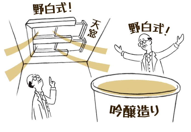 野白氏が開発し、全国の酒造に広まったのは熊本酵母だけではありません。麹室の換気と温度調節に画期的な効果をあげる「野白式天窓」を考案したほか、温暖な九州の地でも可能な「野白式吟醸造り」を築き上げました。これらの創意工夫を凝らした技術は、今でも全国の酒造で採用されています。